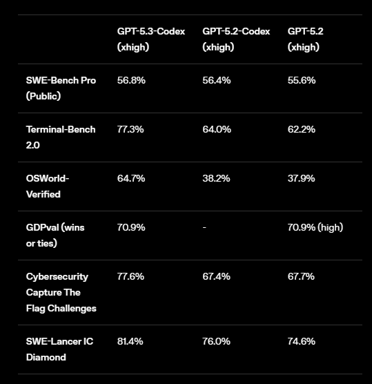OpenAI has released GPT-5.3-Codex, its latest coding model. The company says it combines GPT-5.2-Codex's coding capabilities with GPT-5.2's reasoning and knowledge, while running 25 percent faster. Most notably, on Terminal-Bench 2.0 it beats the just-released Opus 4.6 by 12 percentage points—a significant gap by current AI standards—while using fewer tokens than its predecessors. On OSWorld, an agentic computer-use benchmark, it scores 64.7 percent versus 38.2 percent for GPT-5.2-Codex. On GDPval, OpenAI's benchmark for knowledge-work tasks across 44 occupations, it matches GPT-5.2.