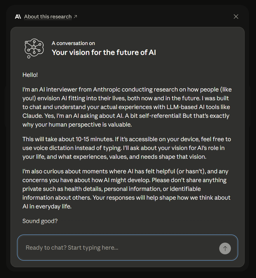 The company says it will now use the interview tool more broadly. Claude.ai users may start seeing pop-ups inviting them to participate in interviews. Anthropic plans to analyze and publish the anonymized findings as part of its social impact research.