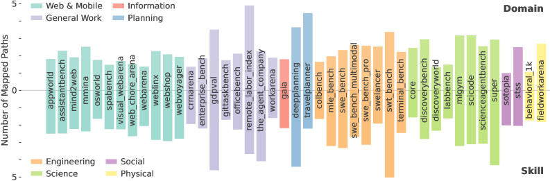 - The imbalance extends to individual skills as well: benchmarks primarily evaluate information retrieval and computer-based work, while critical capabilities such as interpersonal interaction are almost entirely ignored.