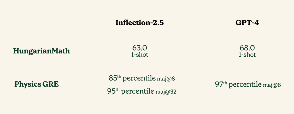 The model was also tested on the Hungarian math exam, which should be excluded from the training data, and on the Physics GRE, an entrance exam for graduate studies in physics. Inflection-2.5 scored at the 85th percentile of human test takers on the physics test, and came close to the maximum score using an extended prompting method, just behind GPT-4.