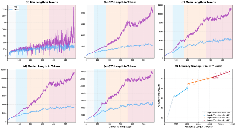 With FIPO, response length grows across the board, not just for outliers. Longer answers track closely with higher accuracy. | Image: Qwen Pilot Team