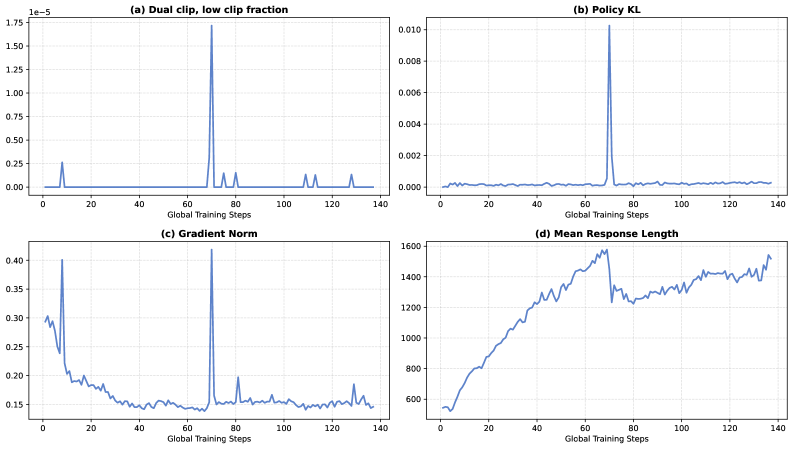 Four charts show training instability without safety mechanisms. Around training step 70, multiple stability metrics spike sharply while mean response length drops from around 1,400 to below 800 tokens.