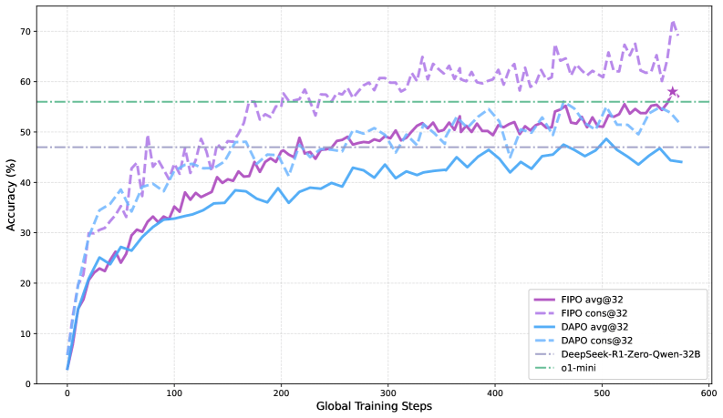 The team tested FIPO on Qwen2.5-32B-Base, a model with zero prior exposure to synthetic long-CoT data. They trained it exclusively on the public dataset from DAPO (Decoupled Clip and Dynamic sAmpling Policy Optimization), a popular open-source GRPO training variant, to keep the comparison fair.