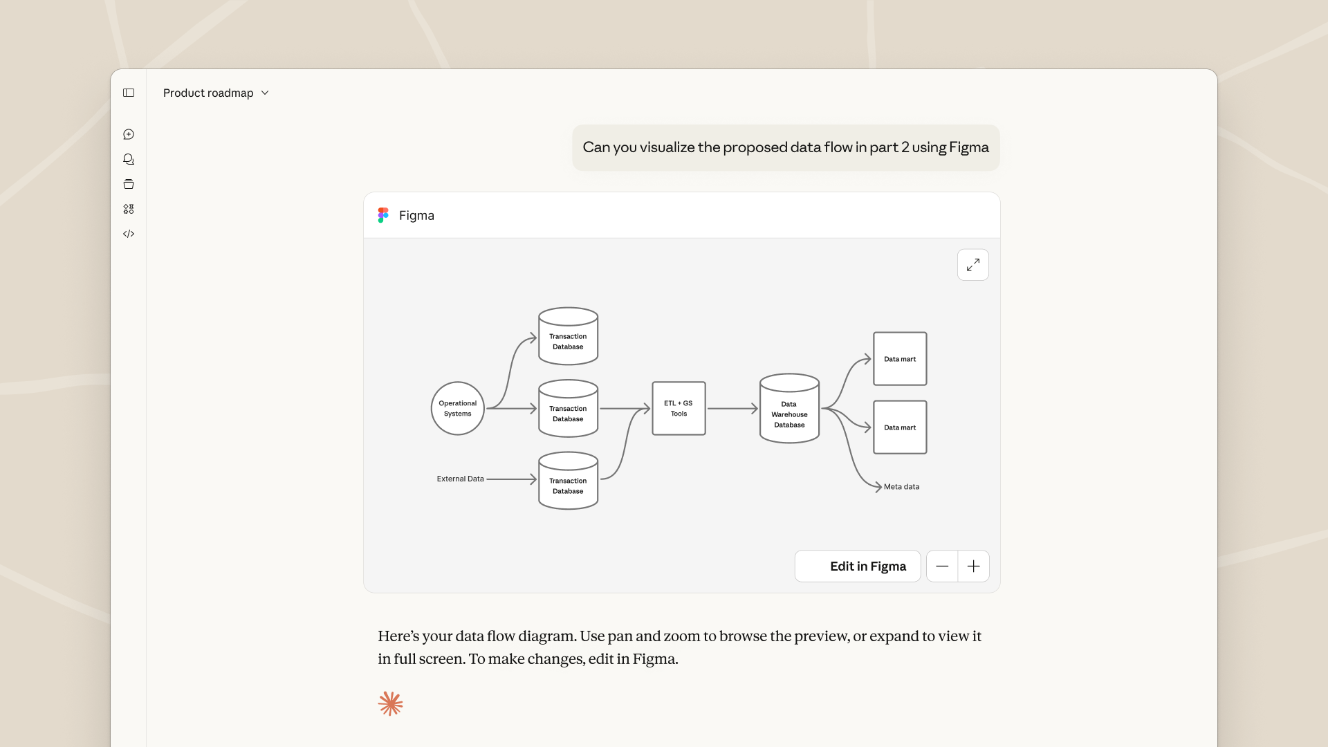 Figma integration running inside Claude's chat interface, showing a data flow diagram that users can edit via Figma. | Image: Anthropic