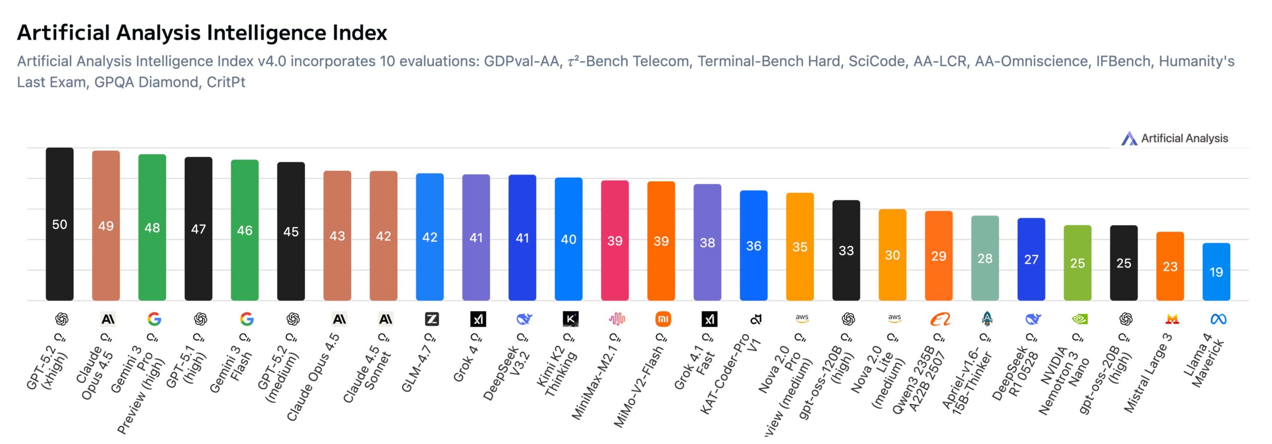 Artificial Analysis just released version 4.0 of its Intelligence Index, ranking AI models across multiple benchmarks. OpenAI's GPT-5.2 at its highest reasoning setting takes the top spot, with Anthropic's Claude Opus 4.5 and Google's Gemini 3 Pro close behind.