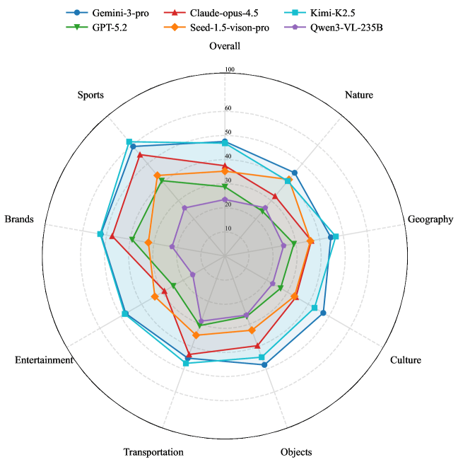 Researchers at Moonshot AI, the company behind the Kimi model series, have released a new benchmark called WorldVQA. The dataset includes 3,500 image-question pairs across nine categories, covering everything from nature and architecture to culture, art, brands, sports, and well-known personalities.