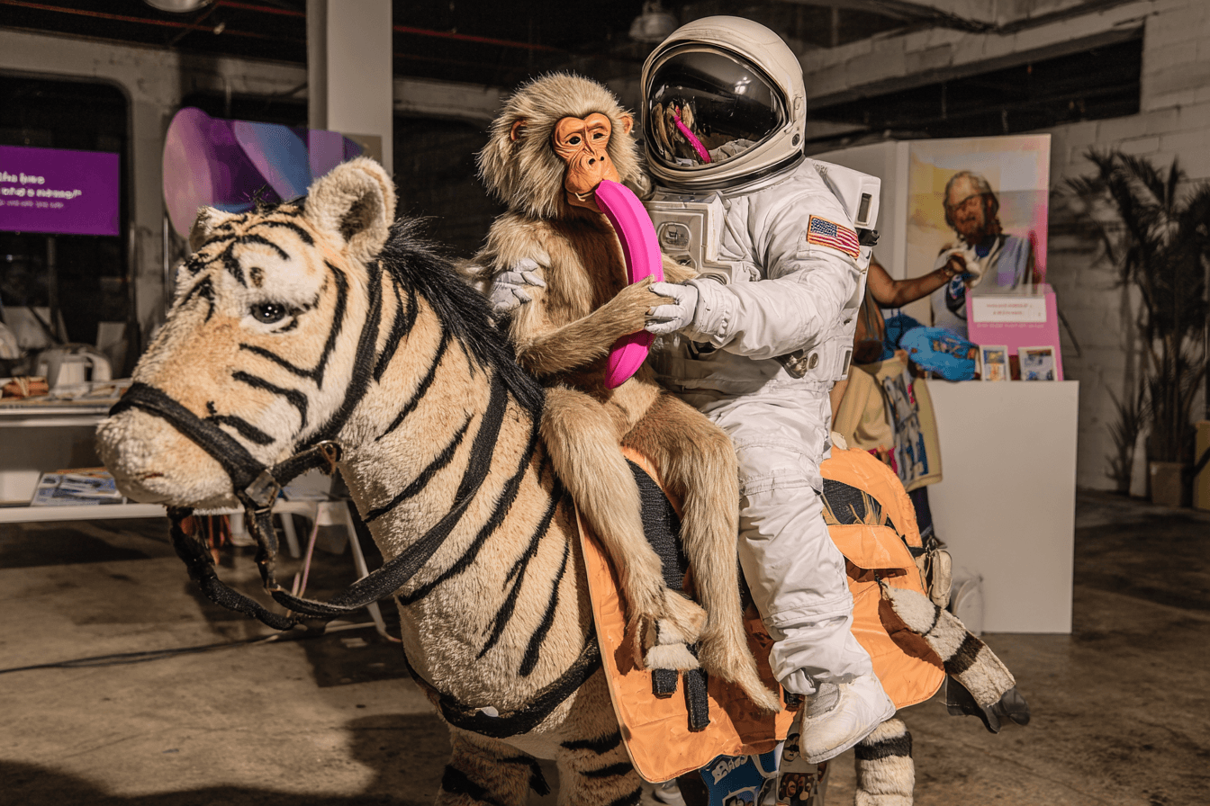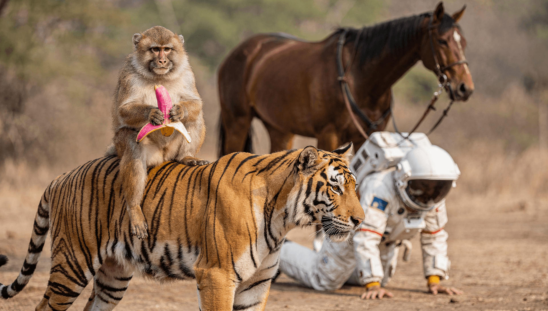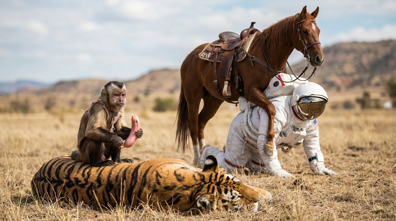 A hyper-realistic DSLR photo. A monkey holding a pink banana is sitting on a tiger in the foreground. In the background, a HORSE is RIDING AN ASTRONAUT. The astronaut is underneath like a living "spacesuit horse saddle," and the HORSE is clearly on top, in control, as the rider. Make it 100% unambiguous: the HORSE is the rider and the ASTRONAUT is being ridden, NOT the other way around. High-resolution, sharp focus, realistic lighting.