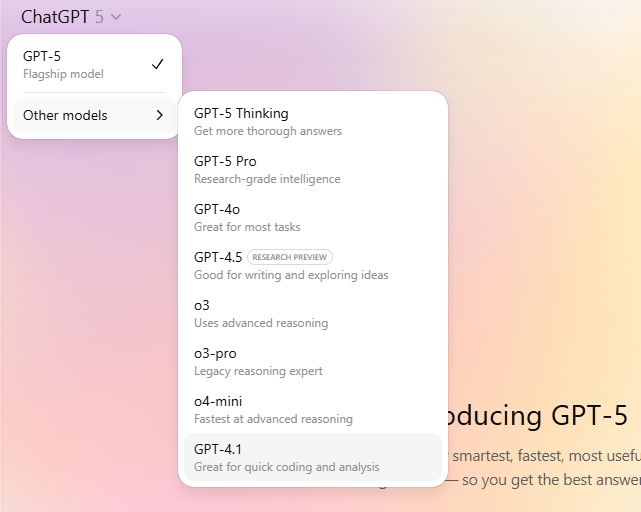 ChatGPT now defaults to GPT-5 automatically selecting the model for each task, which may help beginners but feel less transparent to advanced users. A setting is still available to enable access to older "legacy" models such as o3 and GPT-4o. When turned on, these can be manually chosen from the "Other models" menu. This manual option applies only to past models. The GPT-5 "Thinking" and "Pro" versions can also be selected manually, but only by Pro subscribers.