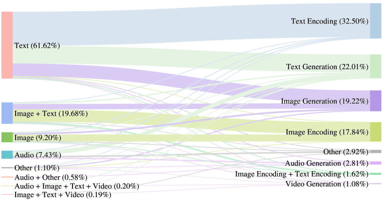 Sankey diagram: Input shares on the left: Text 61.62%, image+text 19.68%, image 9.20%, audio 7.43%, other combinations <1.1%. Outputs on the right: Text encoding 32.50%, text generation 22.01%, image generation 19.22%, image encoding 17.84%, audio generation 2.81%, video generation 1.08%, other/miscellaneous categories 2.92% and 1.62% (image encoding + text encoding).
