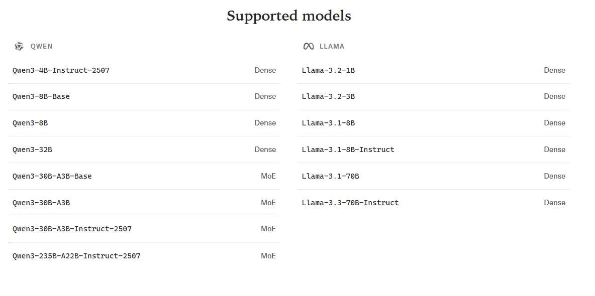 Tinker supports open-weight models from Meta and Alibaba, including large-scale variants like Qwen-235B-A22B. | Image: Thinking Machines