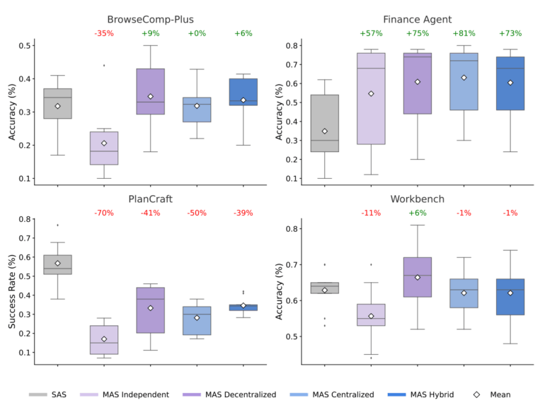 Multi-agent systems that break tasks into smaller pieces across multiple agents to increase controllability and transparency aren't a universal solution either. A recent study from Google Research, Google DeepMind, and MIT with 180 experiments shows that multi-agent performance varies by task from significant improvement to massive deterioration.