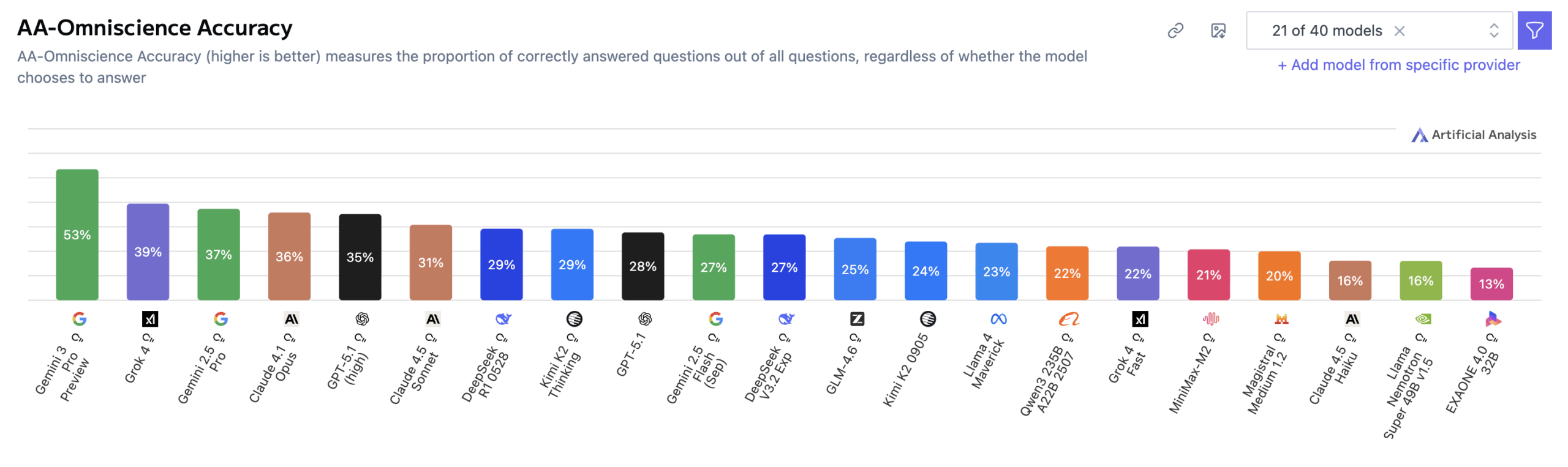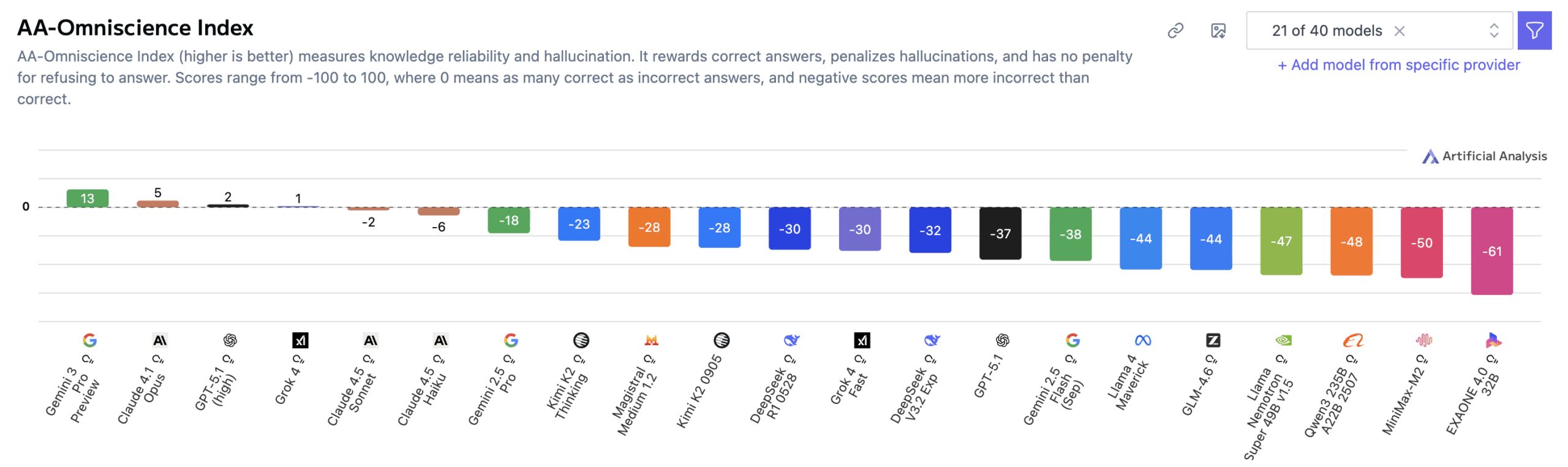 A new benchmark from Artificial Analysis reveals alarming weaknesses in the factual reliability of large language models. Out of 40 models tested, only four achieved a positive score - with Google's Gemini 3 Pro clearly in the lead.