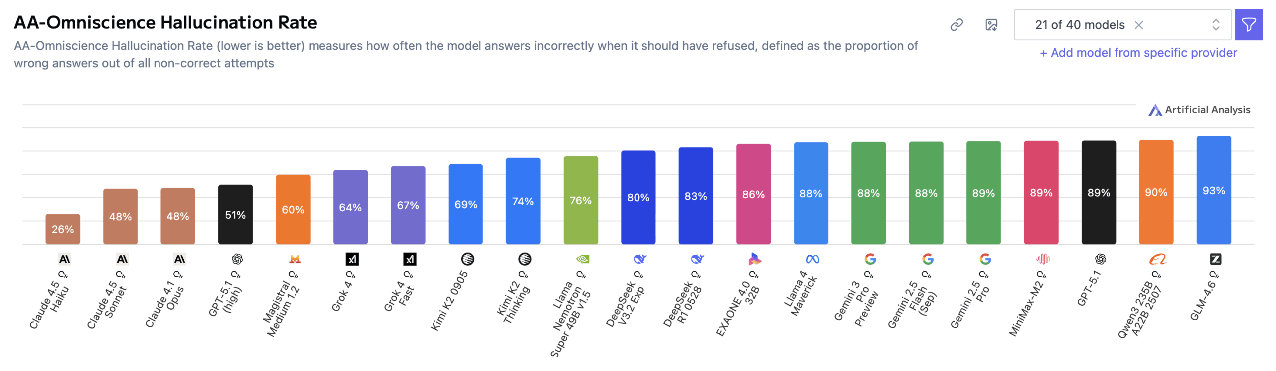 Here, hallucination rate refers to the share of false responses among all incorrect attempts - meaning a high value indicates overconfidence, not ignorance.