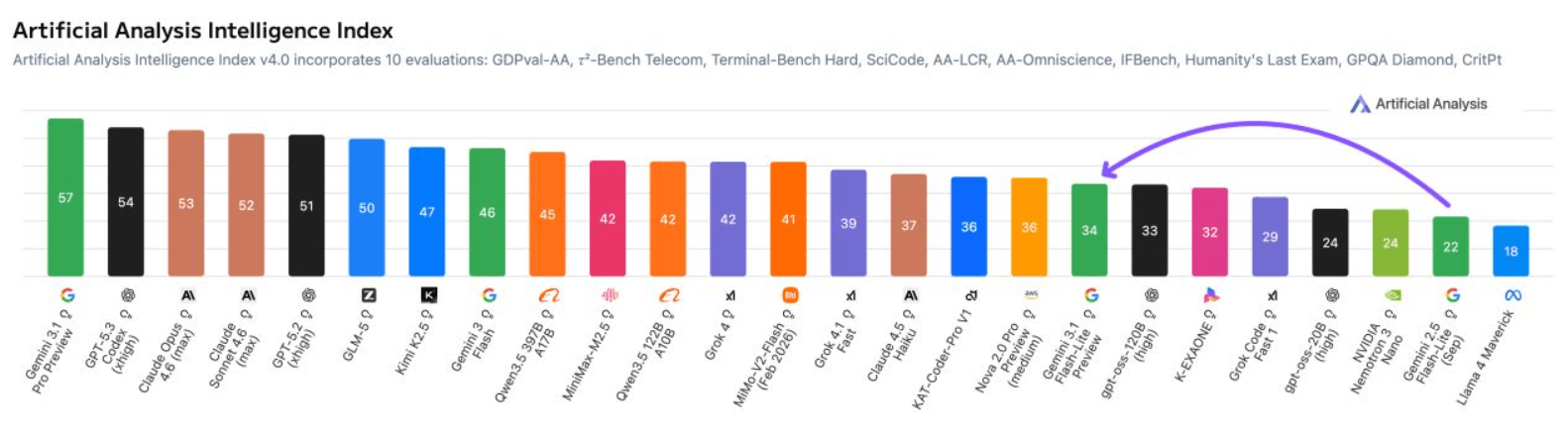 According to Artificial Analysis, the model scores 34 points on their Intelligence Index, a 12-point jump over its predecessor, Gemini 2.5 Flash-Lite. Despite the big leap in capability, it keeps up the same speed as the previous version, cranking out more than 360 tokens per second with an average response time of 5.1 seconds.