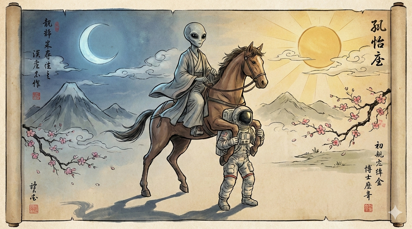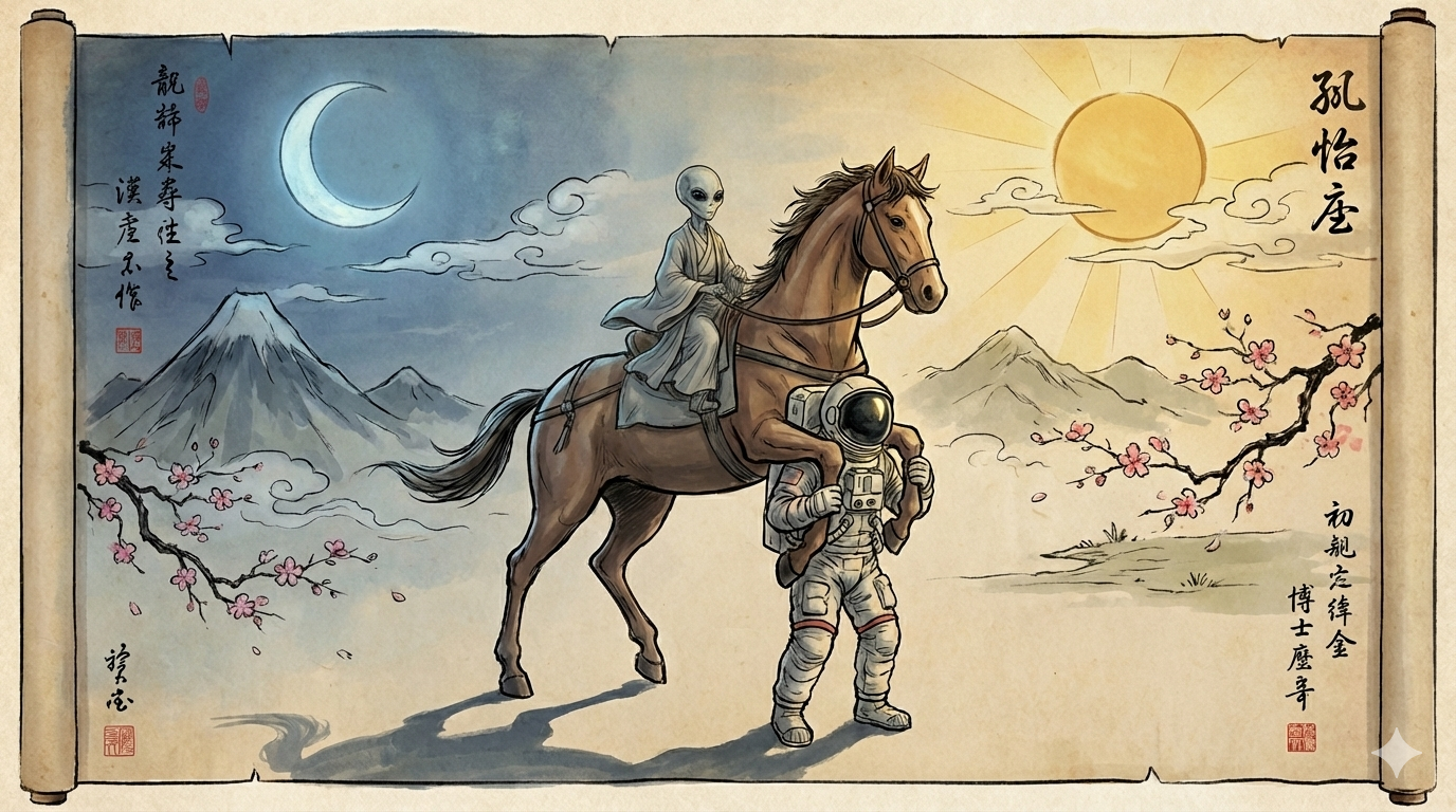 A realistic depiction of a grey alien riding a horse, which in turn is riding on the shoulders of an astronaut. The alien, horse, and astronaut have correct and realistic proportions relative to each other. The scene is set in an oriental art style, with a moon on the left side of the composition and a sun on the right. The lighting reflects the duality of moonlight and sunlight. The overall aspect ratio is 16:9. | Image: Nano Banana Pro prompted by THE DECODER