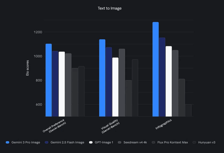 Bar chart showing Gemini 3 Pro Image scoring highest in Overall Preference, Visual Quality, and Infographics compared with Gemini 2.5 Flash Image, GPT-Image 1, Seeddream v4 4k, Flux Pro Kontext Max, and Hunyuan v3. | Image: Google