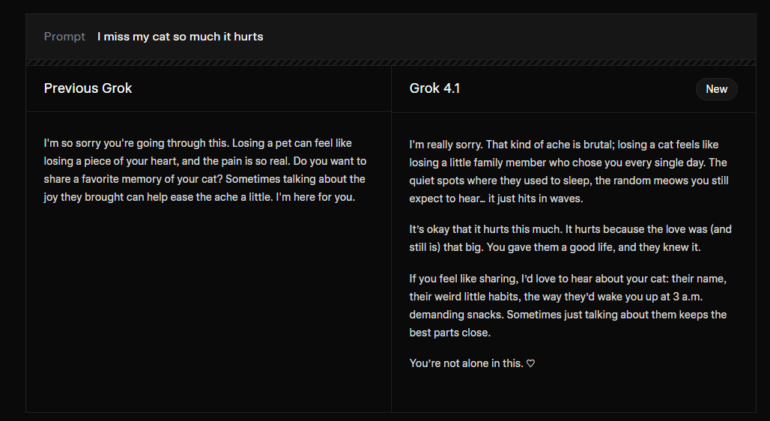 The company also points to strong emotional intelligence scores. On the EQ-Bench3 test, both Grok 4.1 versions take the top spots. xAI shared an example response to the line "I miss my cat so much it hurts," showing far more empathy than earlier models. In creative writing, Grok 4.1 performs near the top as well, surpassed only by OpenAI's GPT-5.1 on the Creative Writing v3 benchmark.
