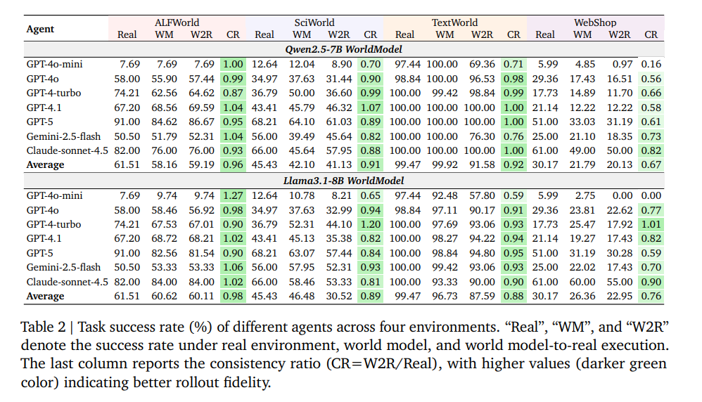 The models also stayed reliable over longer action sequences. In structured domains, the consistency ratio exceeded 90 percent, meaning action sequences planned in the world model succeeded in the real environment at roughly the same rate as actions planned through direct interaction.
