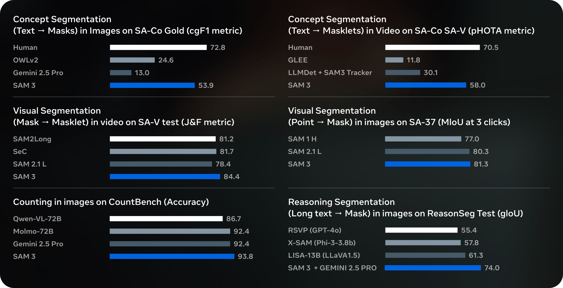 In internal benchmarks, specifically the new "Segment Anything with Concepts" (SA-Co) test, SAM 3 reportedly doubles the performance of existing systems. Meta claims the model outperforms specialized tools like GLEE and OWLv2, as well as large multimodal models like Gemini 2.5 Pro.