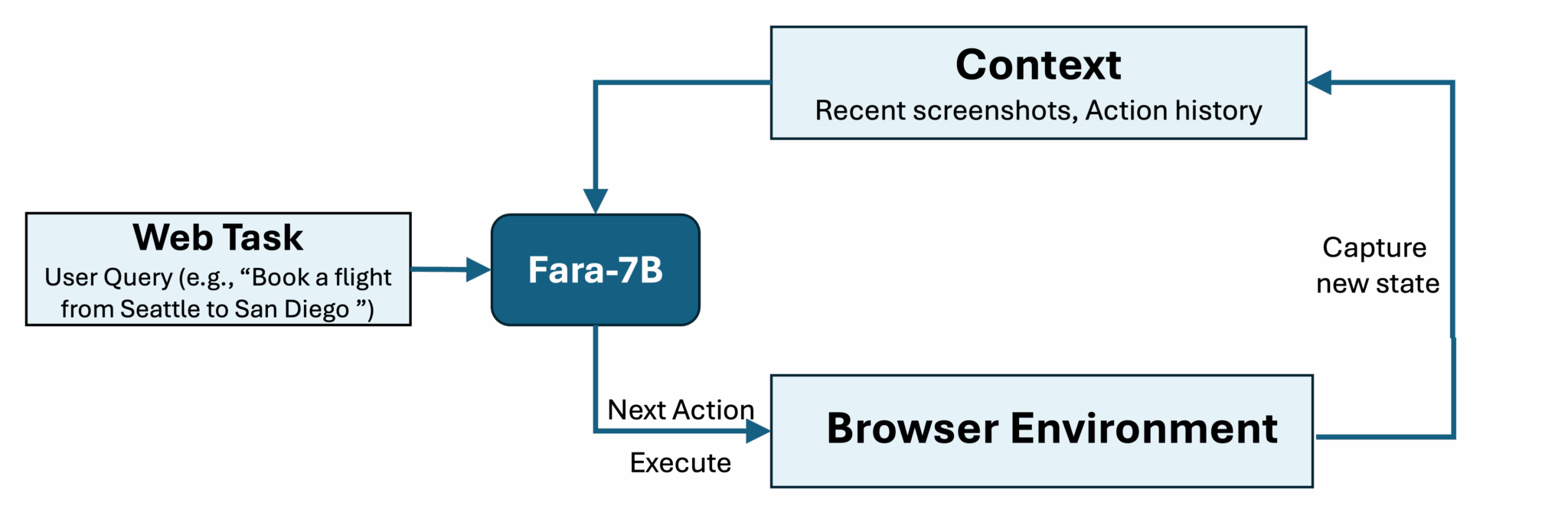 Fara-7B is based on Alibaba's Qwen2.5-VL-7B and, according to Microsoft, relies solely on visual information. Instead of tapping into accessibility trees or parsing HTML, it works directly off screenshots of the interface. The model runs in a loop of observing, thinking, and acting, predicting click coordinates or generating keystrokes as needed. It uses the last three screenshots, previous actions, and user input to decide what to do next.