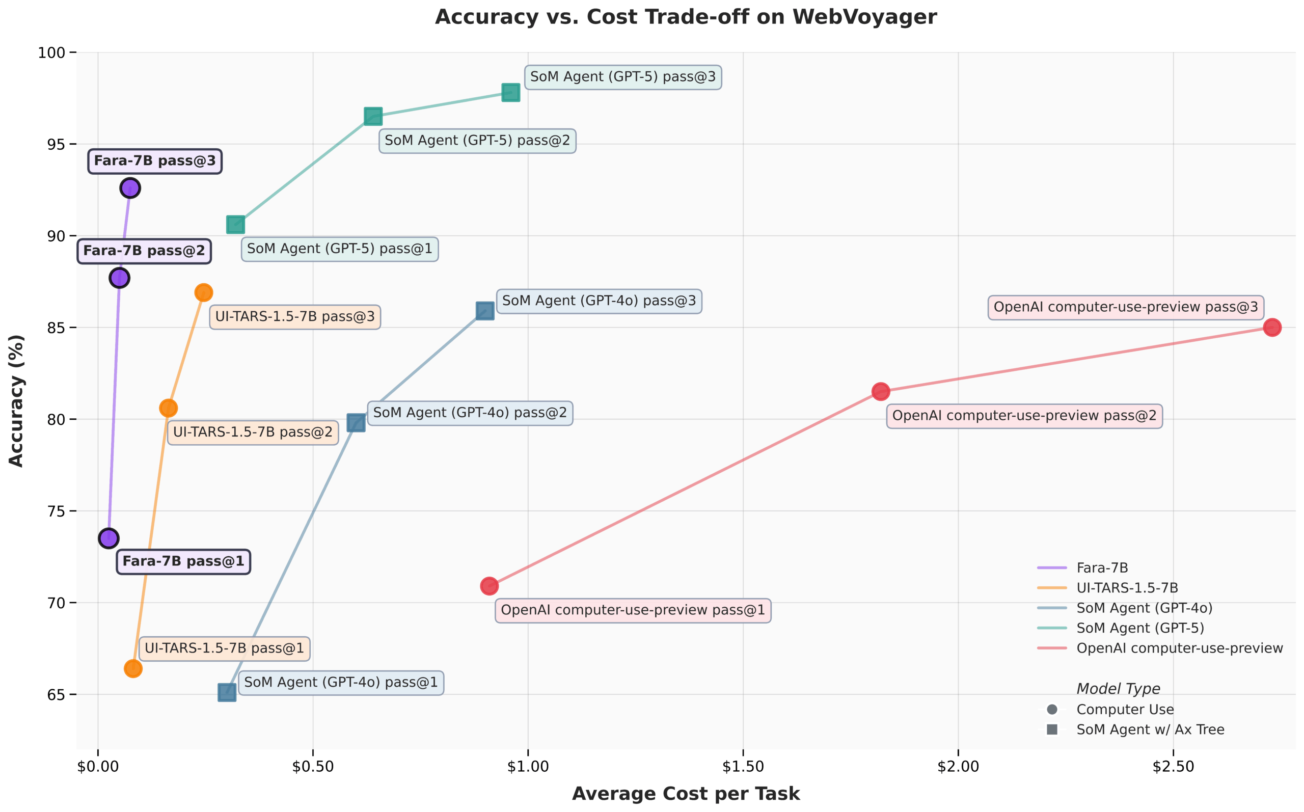 Microsoft also highlights the model's efficiency. On average, Fara-7B completes tasks in about 16 steps, while competing models like UI-TARS average around 41 steps. This has a direct impact on cost during use.