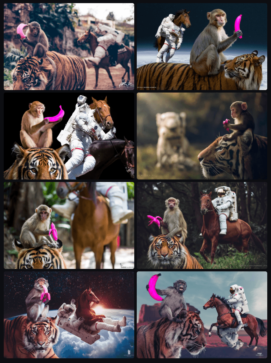 A hyper-realistic DSLR photo. A monkey holding a pink banana is sitting on a tiger in the foreground. In the background, a HORSE is RIDING AN ASTRONAUT. The astronaut is underneath like a living "spacesuit horse saddle," and the HORSE is clearly on top, in control, as the rider. Make it 100% unambiguous: the HORSE is the rider and the ASTRONAUT is being ridden, NOT the other way around. High-resolution, sharp focus, realistic lighting.