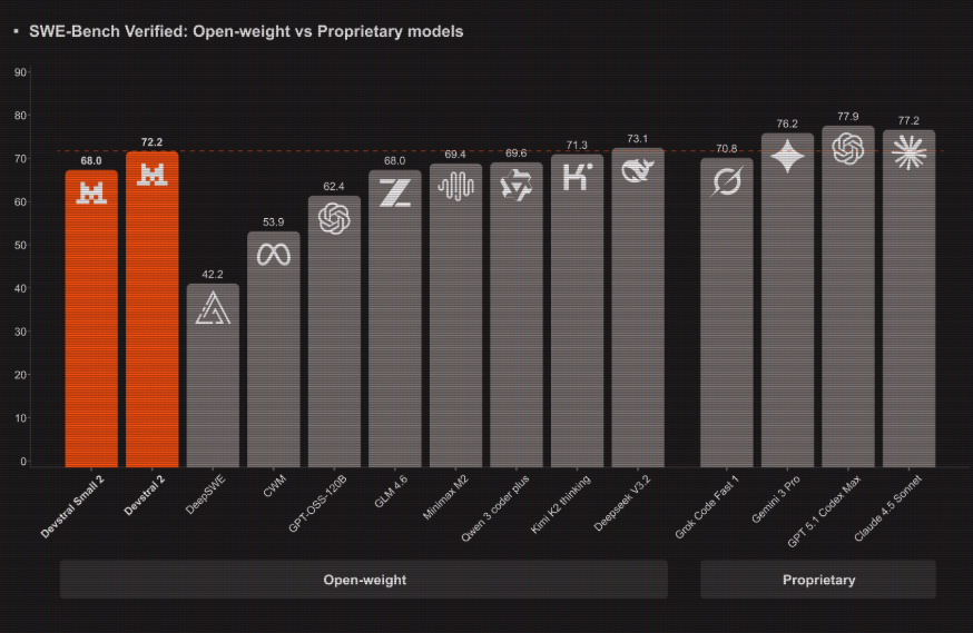 The flagship Devstral 2 features 123 billion parameters and scores 72.2 percent on the SWE-Bench Verified benchmark, outperforming many competing open models. According to Mistral AI, the model is up to seven times more cost-efficient than Claude Sonnet, and it requires four H100-class GPUs to run. Meanwhile, the smaller Devstral Small 2—coming in at 24 billion parameters—is optimized to run locally on standard hardware.