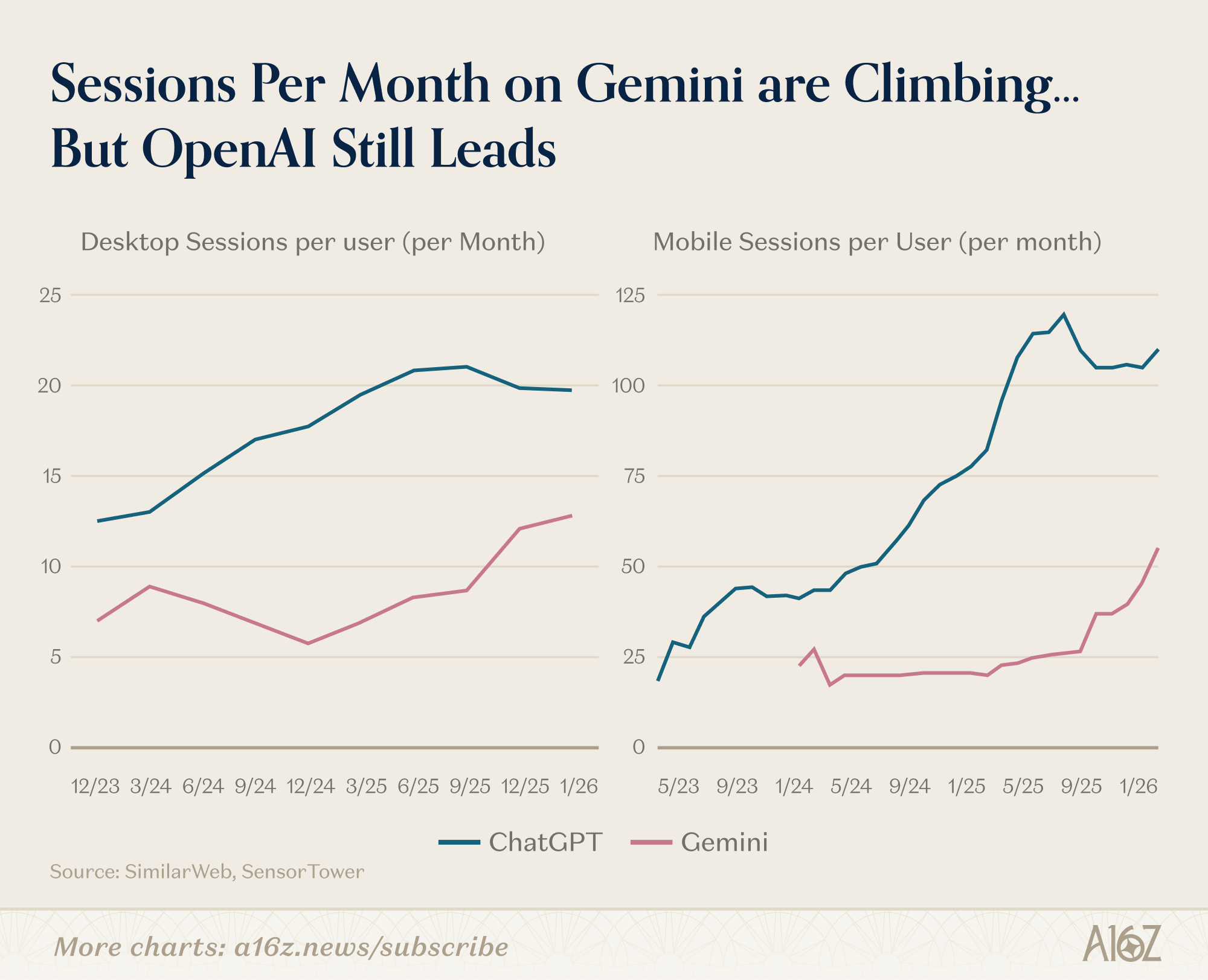 Two line charts showing monthly sessions per user for ChatGPT and Gemini on desktop and mobile from 2023 to January 2026. ChatGPT averages around 20 desktop sessions per month, Gemini around 12. On mobile, the gap is wider: ChatGPT reaches over 100 sessions, Gemini about 50.