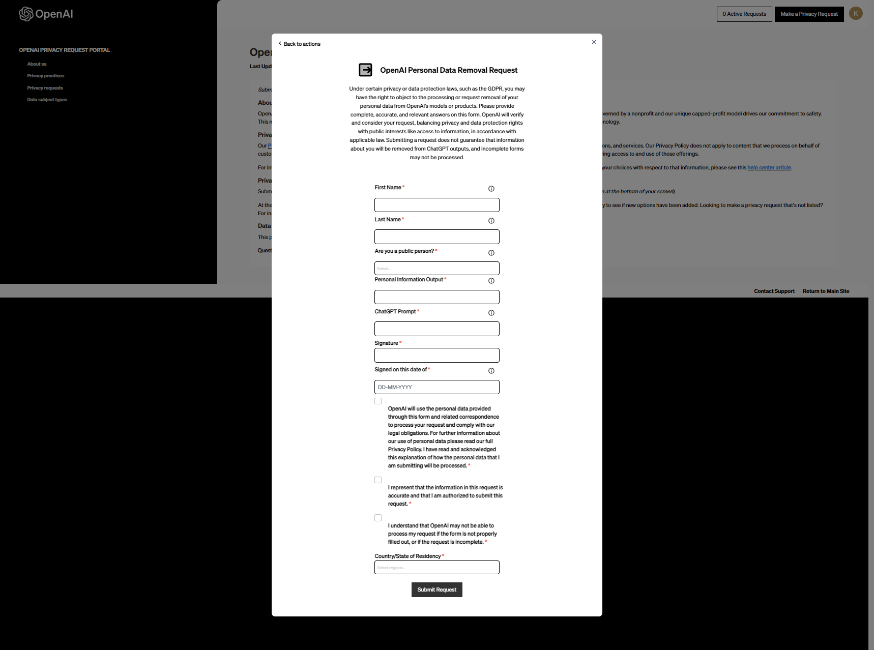 OpenAI will verify and consider your request, balancing privacy and data protection rights with public interests like access to information, in accordance with applicable law. Submitting a request does not guarantee that information about you will be removed from ChatGPT outputs, and incomplete forms may not be processed.