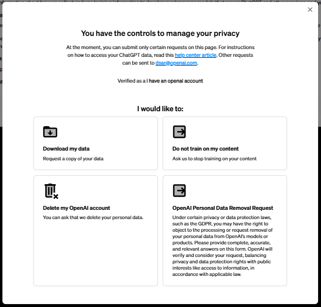 Individuals can opt out of processing or request that their personal data be removed from OpenAI's models or products, ostensibly in compliance with privacy laws such as the GDPR. However, OpenAI notes: