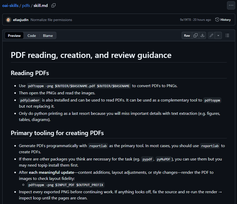 Judin found directories named "pdfs" and "spreadsheets" containing "skill.md" files. These files provide specific instructions for processing documents and data. It's basically like your prompt calling a more specific prompt to solve a complex subtask necessary for the main goal—like extracting text from a PDF. Since it's just a folder containing a Markdown file and maybe scripts, it's easy to adapt.