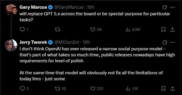 When OpenAI critic Gary Marcus asked whether the model is intended to replace GPT-5.x or serve as a task-specific specialist, Tworek said OpenAI has never released a narrowly focused model. He explained that “public releases nowadays have high requirements for level of polish,” and added: “At the same time that model will obviously not fix all the limitations of today llms - just some.”