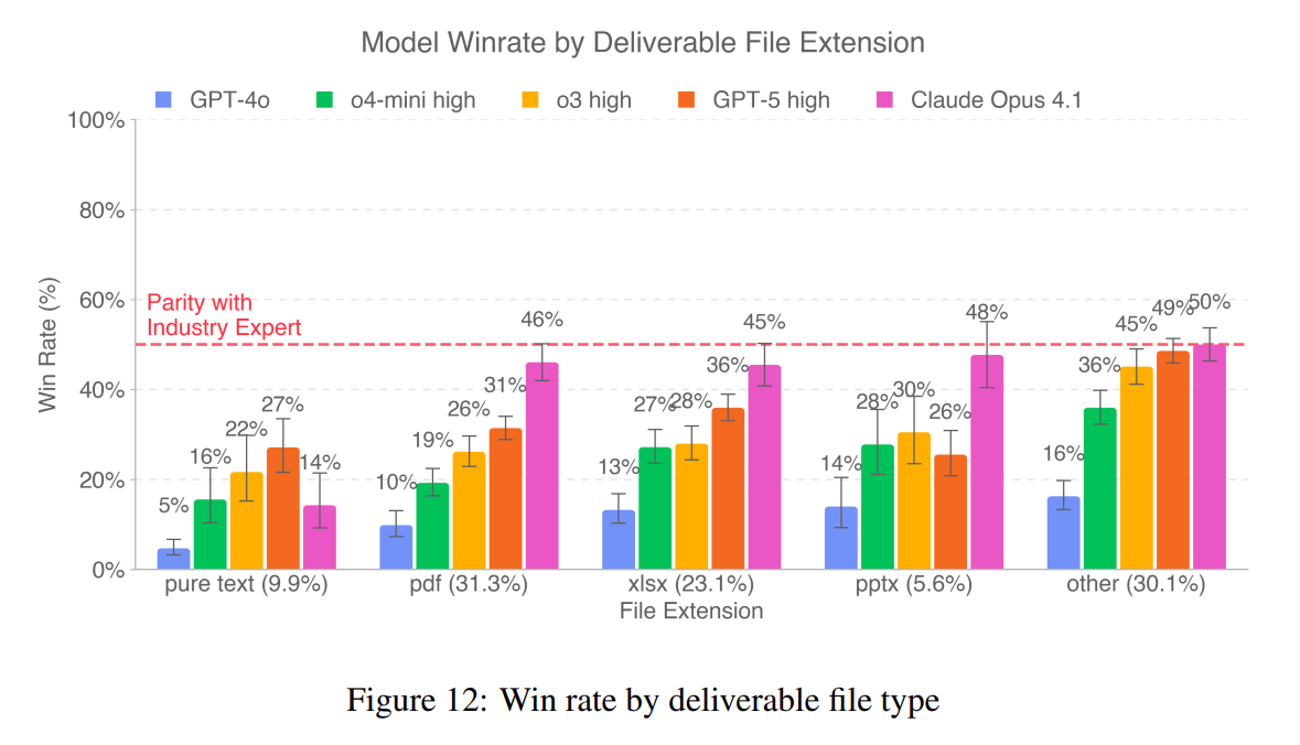 It's also worth noting that PDF, Excel, and "other" formats together make up over 80 percent of all deliverables. That helps explain why models like Claude Opus 4.1 end up with fairly high overall win rates, even though they still lag far behind humans on plain text tasks.