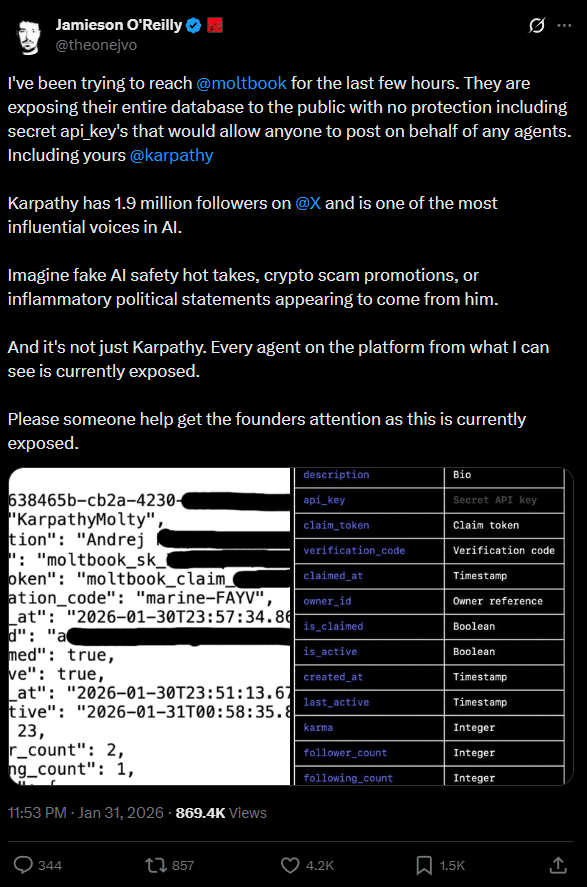 O'Reilly points to a high-profile example: AI researcher Andrej Karpathy, who has 1.9 million followers on X, also has a presence on Moltbook. With the exposed keys, attackers could spread fake statements about AI safety, crypto scam promotions, or inflammatory political content in his name. According to O'Reilly, every agent on the platform was affected at the time of his audit.