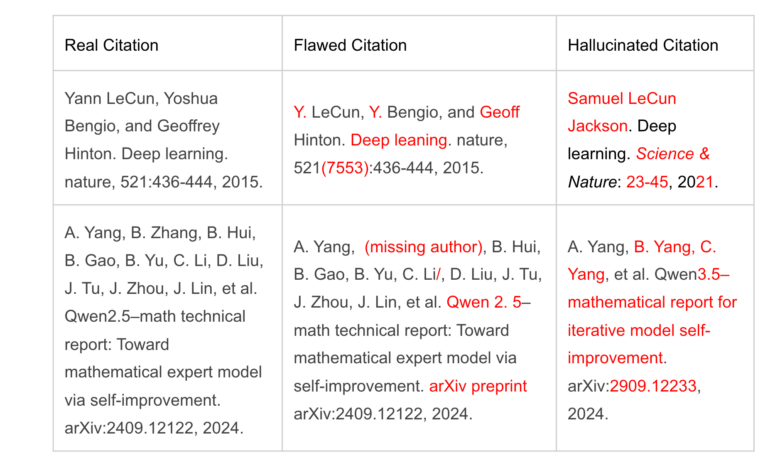 The documented cases reveal a wide range of errors. The paper "SimWorld" lists the obviously fictional authors "John Doe and Jane Smith." In "Unmasking Puppeteers," DOIs and URLs lead nowhere. A paper on semantic uncertainty quantification contains 15 hallucinated citations, including incomplete arXiv IDs like "arXiv:2305.XXXX."
