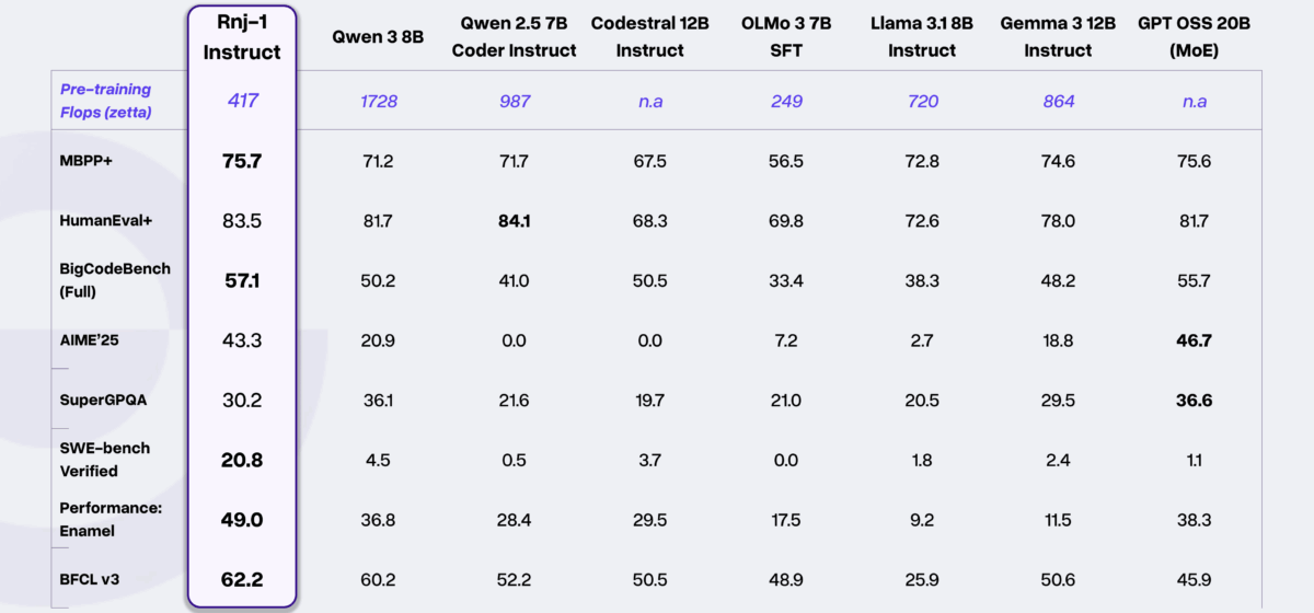 Essential AI's new open-source model, Rnj-1, outperforms significantly larger competitors on the "SWE-bench Verified" test. This benchmark is considered particularly challenging because it evaluates an AI's ability to independently solve real-world programming problems. Despite being a compact model with just eight billion parameters, Rnj-1 scores 20.8 points.