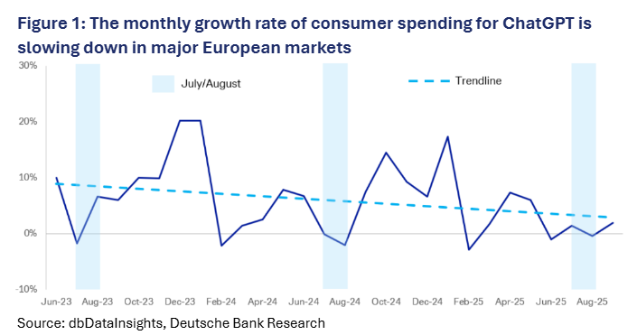 Spending on ChatGPT has leveled off in Europe, according to a new report from Deutsche Bank. The number of paying users hasn't grown since May 2025, even though the service reports 800 million weekly users worldwide. Free alternatives like Google AI Mode and Perplexity may be slowing down the growth of paid subscriptions. OpenAI is already exploring ways to monetize free users, possibly through advertising or commission-based sales links.