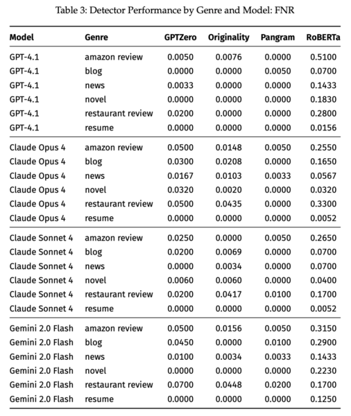Pangram accurately identified generated texts from all four models, with FNR never above 0.02. OriginalityAI's performance varied by model. It was better at catching Gemini 2.0 Flash outputs than those from Claude Opus 4. GPTZero was less affected by model choice but still lagged behind Pangram.