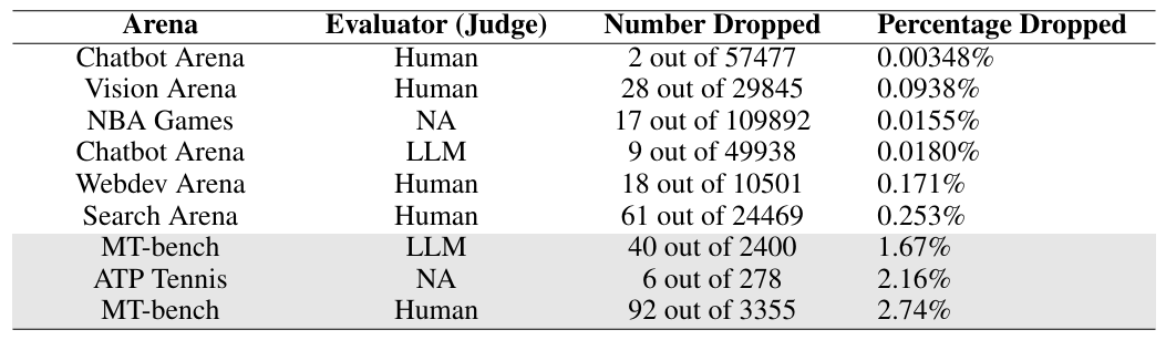 In this case, the top position shifted from GPT-4-0125-preview to GPT-4-1106-preview. The two removed reviews were matchups where GPT-4-0125-preview had lost to much lower-ranked models: Vicuna-13b at rank 43 and Stripedhyena-nous-7b at rank 45. A qualitative check using a strong judge model flagged both preferences as atypical judgments that strayed from what most users would pick.