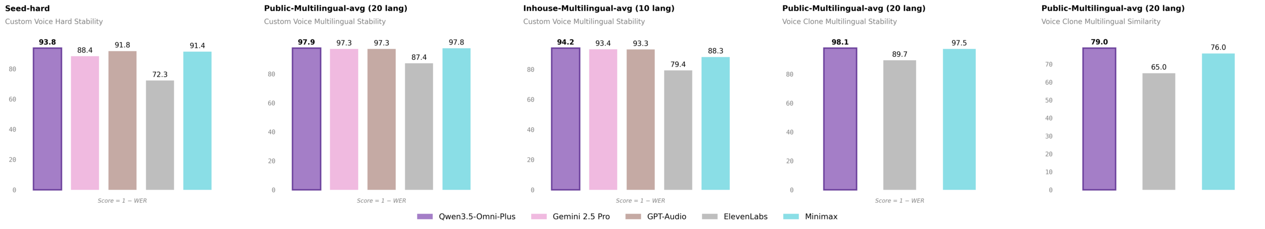 For speech generation, the Qwen team benchmarks against ElevenLabs, Gemini 2.5 Pro, GPT-Audio, and Minimax. On the tough "seed-hard" test set, Qwen3.5-Omni-Plus achieves a word error rate of 6.24. GPT-Audio comes in at 8.19, Minimax at 8.62, and ElevenLabs at 27.70. When cloning voices across 20 languages, the model hits a word error rate of 1.87 and a cosine similarity of 0.79.