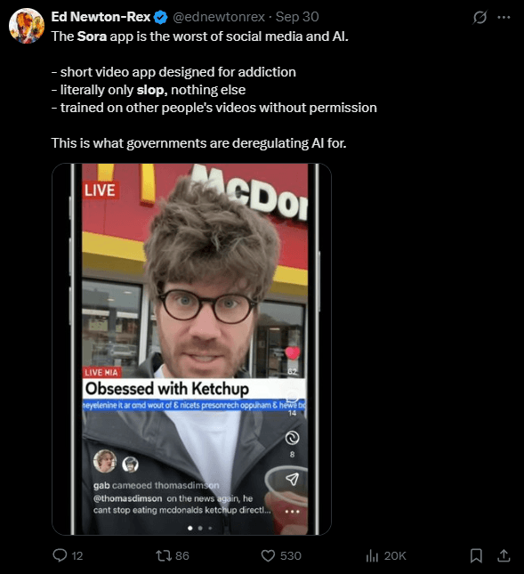 The app quickly drew criticism from the AI community, with critics warning about "AI "slop"—generic, low-value content designed to maximize engagement while lacking creativity or substance. Like TikTok and similar platforms, Sora's format relies on algorithms that optimize for quick reactions, leading to content that often feels interchangeable and shallow.