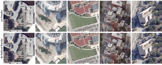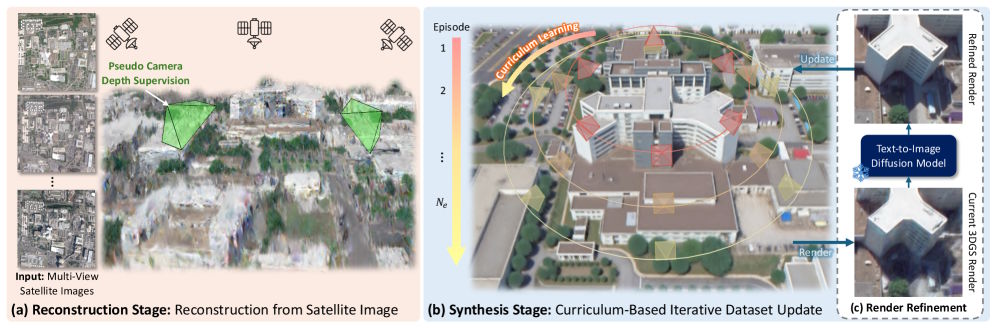Skyfall-GS solves this with a two-step process. First, it creates a rough 3D outline from satellite images. Then, an AI model fills in missing details like facades and street-level textures, similar to how an image generator completes unfinished pictures.