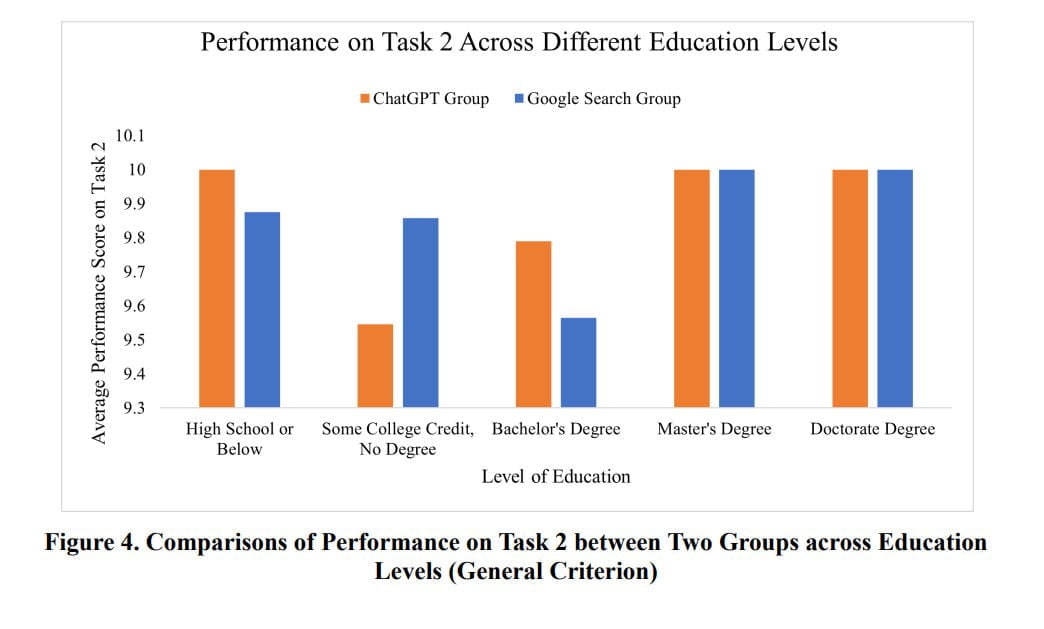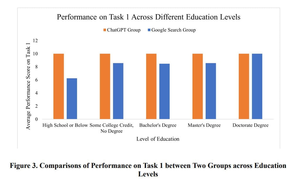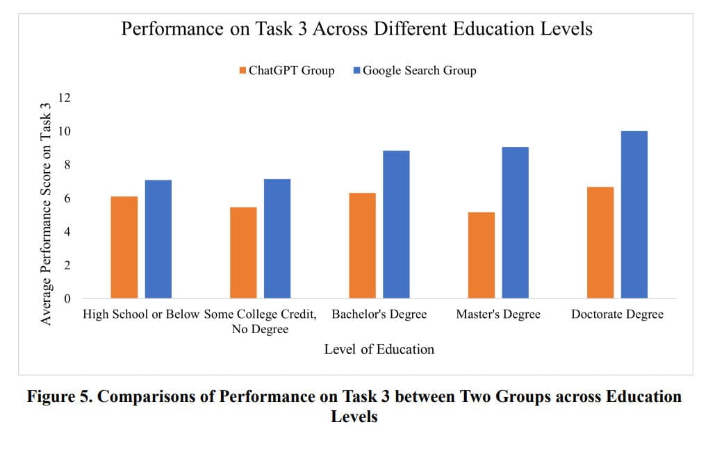 In terms of educational background, the researchers found no differences among ChatGPT participants, but users with higher education showed more competence in using Google.