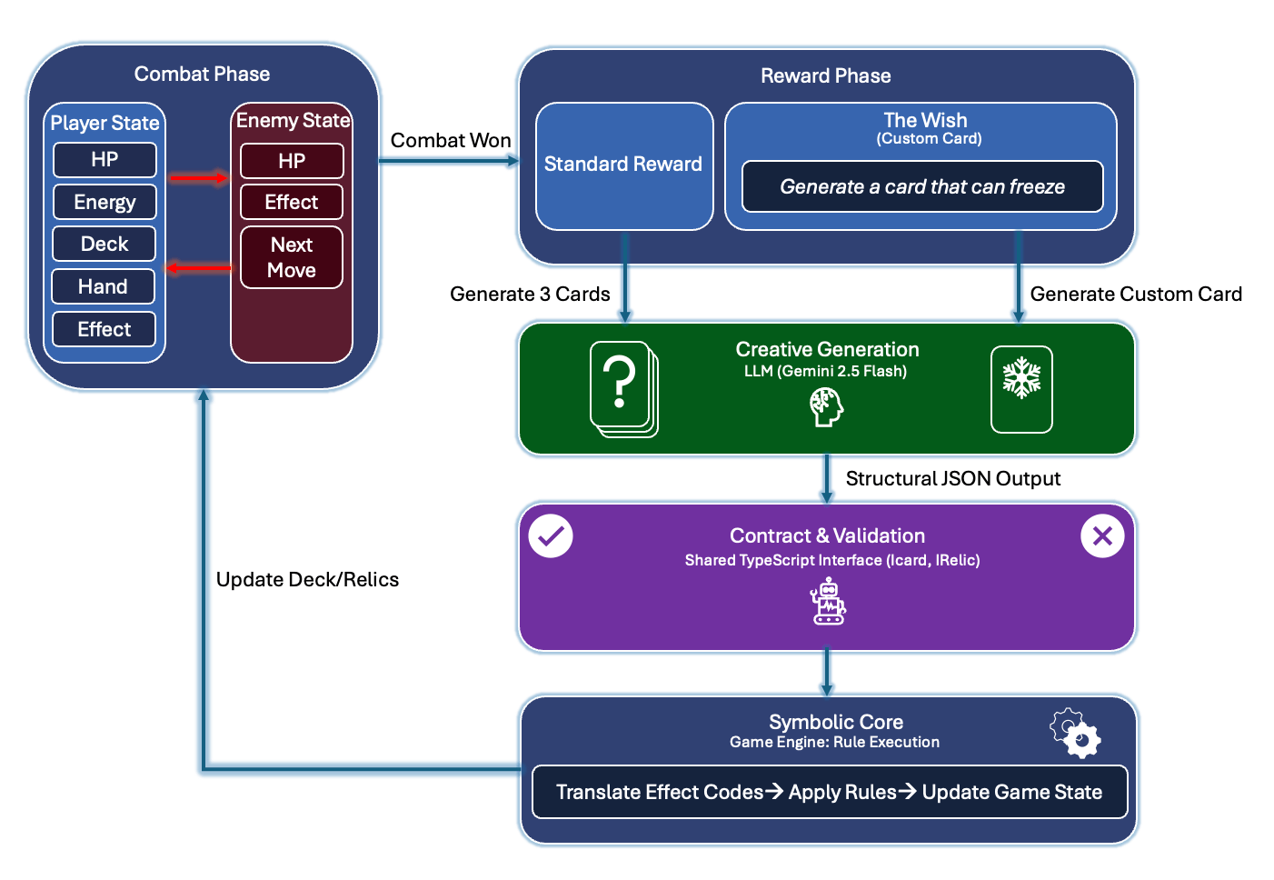A card game called "AI Spire" lets players request custom cards. Type "a fireball that does a lot of fire damage but also freezes your opponent," and the system generates a matching card. The code uses schema validation to make sure the card follows game rules and stays within limits for things like costs and card types.